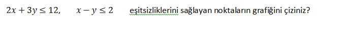 3x+2y=18 doğrusunun eksenleri kestiği noktalar (6,0) ve (0,9) noktalarıdır. 3.0+2.0=0<18 olduğundan (0,0) noktası