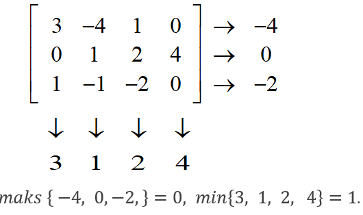 1. sütun seçildiğinde garantilenmiş kayıp (1, 5, -1) sayılarının en büyüğü olan 5’tir. 2. sütun seçildiğinde garantilenmiş kayıp (-3, 4, 2) sayılarının en büyüğü olan 4’tür. Cevap 5+4 = 9’dur.