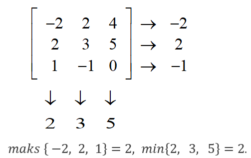 Her satırın karşısına en küçük elemanı, sütunların altına en büyük elemanını yazıp birincilerin maksimumunu, ikincilerin minimumunu bulalım: