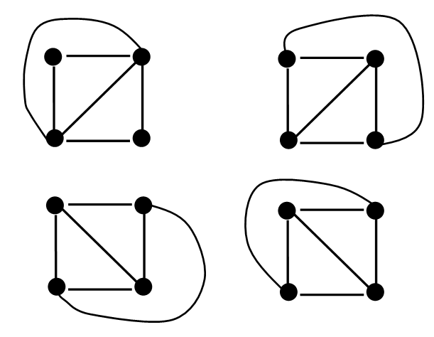 Verilen çizgenin 4 köşesi, 6 kenarı ve her bir köşenin de üç komşusu vardır. Tüm köşe noktalarının derecesi 3’tür. Ancak bu çizge düzlemsel bir çizgedir. Çünkü verilen çizge aşağıdaki biçimlerde çizilebileceğinden