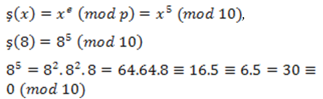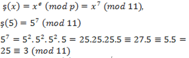 Şifreleme fonksiyonu ş(x)= x8 (mod 45) ifadesini kullanırsak; ş(12)=12⁸ (mod 45) olmalıdır. Bu yüzden; 12⁸≡36 (mod 45) olur.
