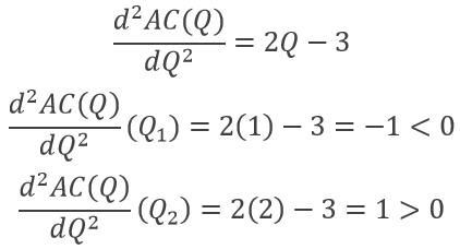 Görüldüğü gibi Q2=2 ortalama maliyet fonksiyonunun türevinde değerlendirildiğinde pozitif sonuç bulunmuştur. Maliyeti minimum kılan değer ikinci türevi pozitif yapan değerdir. Dolayısıyla firmanın maliyetini minimum yapan üretim düzeyi Q=2’dir
