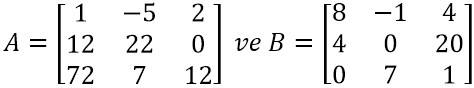 olarak verilmiştir. Buna göre A ve B matrisleri arasında aşağıdaki işlemlerden hangisi yapılamaz?