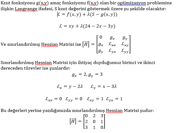 İki değişkenli amaç ve kısıt fonksiyonlarında her üç optimizasyon yönteminde de kısıt altında optimizasyonu sağlayan birinci dereceden koşullar fx/fy = gx/gy şeklindedir.