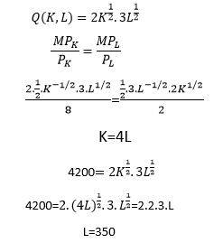 şeklinde verilmiştir.Firma emek (L) için birim başına 2TL. , sermaye (K) için birim başına 8 TL. ödemektedir. Firmanın siparişini en ucuz maliyetle gerçekleştirebilmesi için emek (L) faktöründen kaç birim kullanmalıdır?