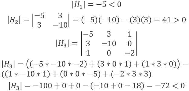 Asal minörlerin işaretlerine bakılır.olduğundan Hessian matrisi negatif belirlidir. Bu durumda (Q1,Q2,Q3) değerlerinin kâr fonksiyonunu maksimum kılan değerler olduğu söylenir. Yani bu düzeylerde kâr durumu söz konusudur.