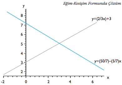 sonucunu buluruz. Çözüm sonucunda x değerini 3 olarak bulundu. y değerini hesaplamak için eğim-kesişim formunun doğrusal fonksiyonlarından herhangi birini kullanabiliriz. Denklemlerden ikincisini kullanalım. Bu denklemde x yerine 3 değerini ikame etmemiz durumunda;