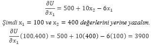 x1 ve x2 mallarını kullanan bir tüketicinin fayda fonksiyonu yukarıda verilmiştir. Tüketici x1 malından 100 ve x2 malından 400 birim tüketiyorsa x1 malının marjinal faydası kaçtır?
