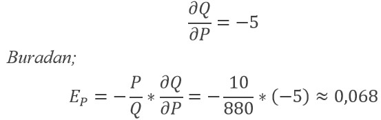 Öncelikle talep edilen miktar hesaplanmalıdır. Q=800-5(20)+2(25)+ 0,05(5000)=1000 olarak bulunur. Ardından talebin fiyat esnekliğini bulabilmek için Q’nun P’ye göre kısmi türevine ihtiyaç duyulmaktadır (dQ/dP=-5). Buradan Ep=-(P/Q)*(dQ/dP)=(-20/700)*(-5)=0,1 olarak bulunur. 14.Soru