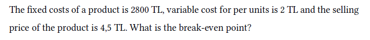 Since the profit is revenue minus the cost we have P(x)=360x-(4800+120x)=240x-4800. Now, to find whether the company loses or makes money insert x=30 into the profit function: P(30)=240·30-4800=+2400, which means that the company gains 2400 TL.