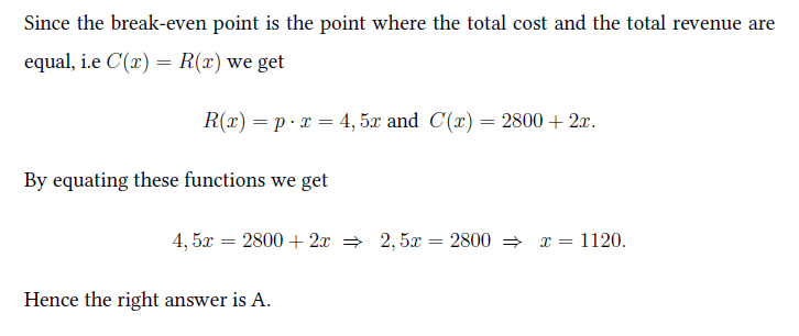 Break-even point is the point where the total cost and the total revenue are equal C(x)=R(x).