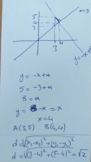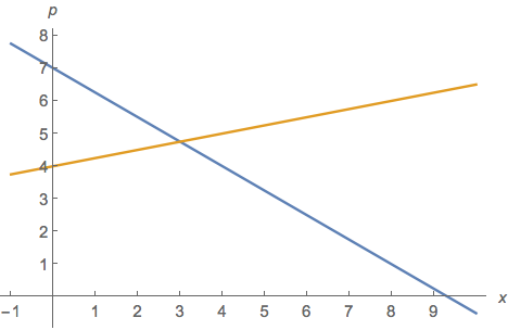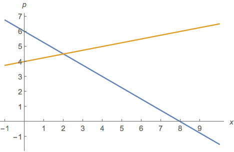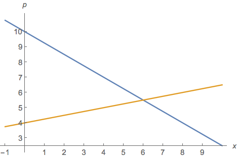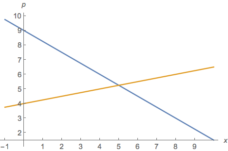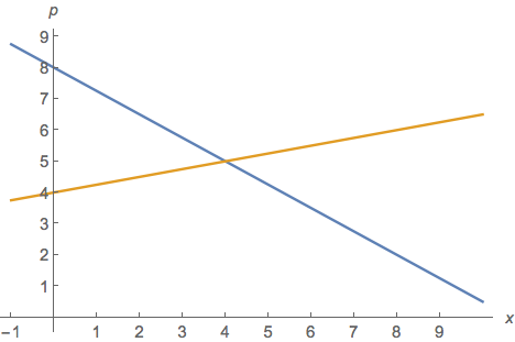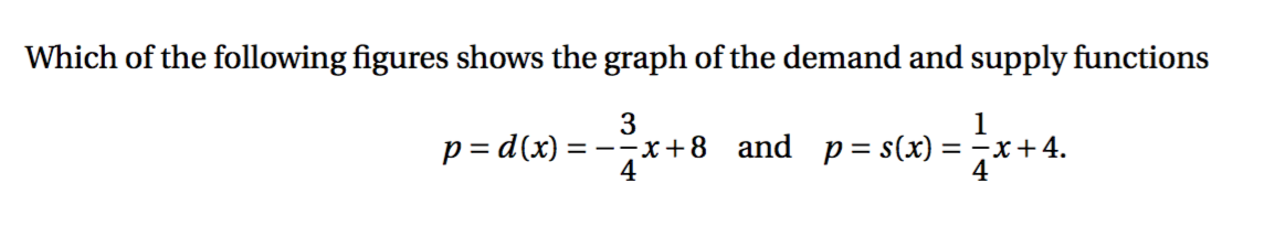 The equilibrium point of given demand and supply functions is the point (4,5). Therefore, we must look for this point for graphs. Correct answer is B.