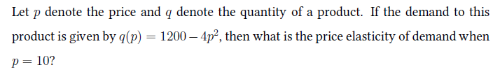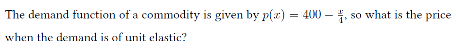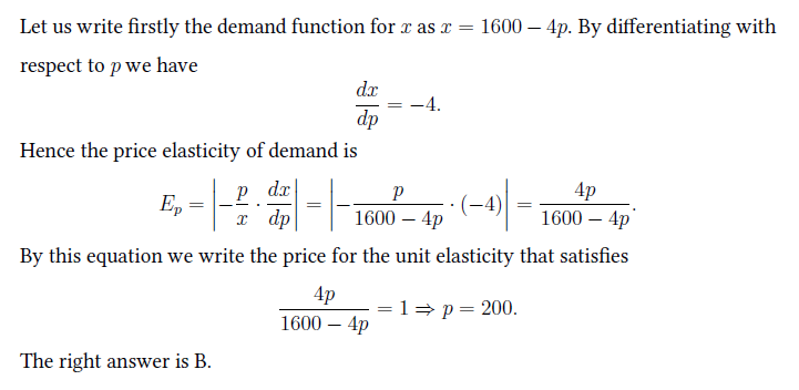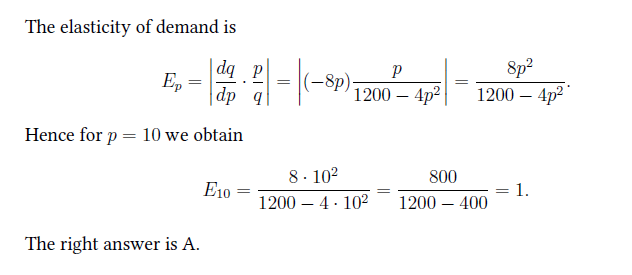 Ep = |(p / q) (dq / dp)| = 1 for unit elastic ; dq / dp = -0.04 p ; Ep = |(p / (600 – (0.02 p2))) (-0.04 p)| = 1 ; p / (600 – (0.02 p2)) (-0.04 p) = 1 ; 0.04 p2 / (600 – 0.02 p2) = 1 ; 0.06 p2 = 600 ; p2 = 10.000 ; p = 100 . pg. 166. Correct answer is C.