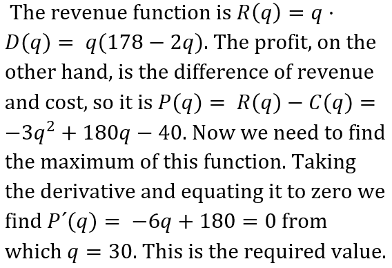 A firm faces the demand schedule of D(q)=178-2q, whereas the total cost function is T(q)=q2-2q+40. What output will maximize the profit?