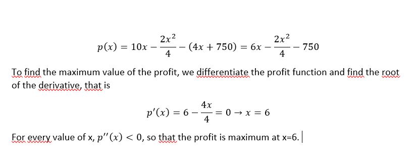 If the total cost function of a product is given by C(x)=4x+750, and the demand is p=10-(2x/4) which of the following is the maximum profit obtained through the sales of this product?