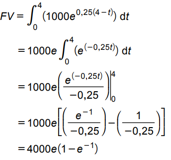 What is the future value at %25 compounded continuously for 4 years for the continuous income stream with a constant rate of flow