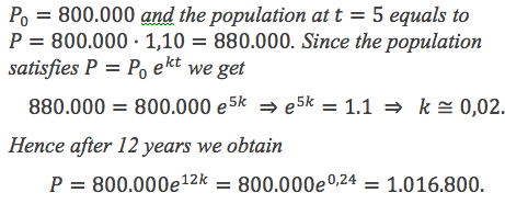 The present population of a city is 800.000 and its population grows at a rate proportional to the present population, increases by 10% in 5 years. What will be the population after 12 years?