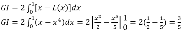 The Lorenz curve for the distribution of income in a certain country in 1986 is given in Figure. What is the Gini index for this mode?