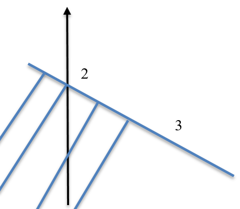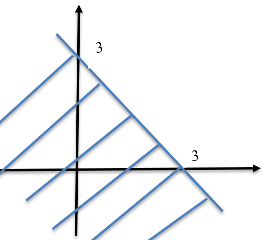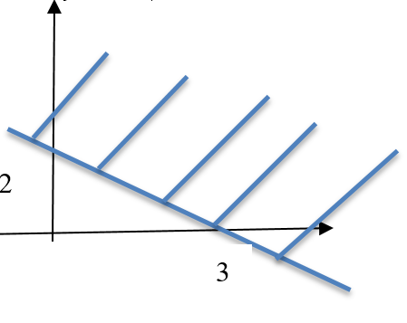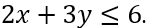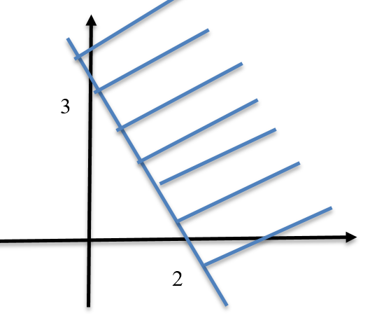 is straight line with x-axis intercept (3,0), y-axis intercept (0,2). The point (0,0) statisfies
