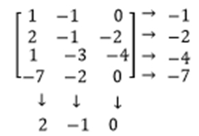 If in the game matrix, there exists an element which is smallest in its row and greatest in its column then this row-column pair is an equilibrium pair. For each row write the lowest element to the right, and for each column write the greatest element below the matrix: