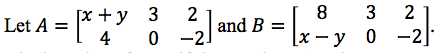 Since A and B are equal matrices then corresponding entries must be equal. This gives x+y=8 and x_y=4. When we solve this system of equations we get x=6 and y=2. Hence x.y=6.2=12