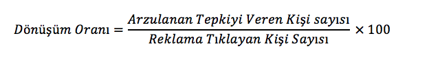 Dönüşüm oranı; reklamveren tarafından önceden belirlenen aktiviteyi gerçekleştiren ziyaretçilerin, reklama tıklayarak siteye gelen ziyaretçilere oranıdır. Bu soruda siteye üye olma pratiği önceden belirlenen bir aktivitedir. Dönüşüm oranı formülü