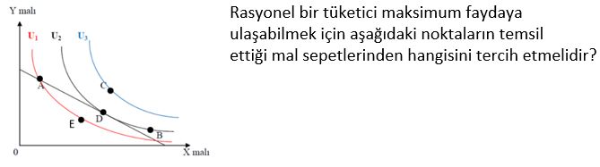 Rasyonel bir tüketici maksimum faydaya ulaşabilmek için aşağıdaki noktaların temsil ettiği mal sepetlerinden D noktasını tercih etmelidir.