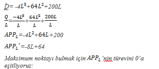 Ortalama fiziki ürünün (APPL) maksimum olduğu nokta, toplam fiziki ürünün azalarak artmaya başladığı noktadır ve bu noktada APPL’nin türevinin 0’aeşitlenmesiyle ortalama fiziki ürünün maksimum olduğu emek seviyesi bulunmaktadır. İlk olarak yapmamız gereken üretim fonksiyonunu emeğe bölerek ortalama fiziki ürünü bulmaktır: