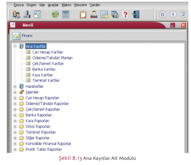 Finans Sekmesi "Ana Kayıtlar" bölümünde kaç tane alt modül vardır?