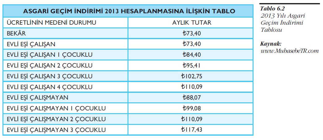 Tablo 6.2 incelendiğinde Asgari Geçim İndiriminin (AGİ) ücretli çalışanın medeni haline göre belirlendiği görülmektedir. Ücret hesaplaması yapılan Ahmet Öztürk isimli personel, evli olup eşi çalışmayan ve 2 çocuklu olmasından dolayı