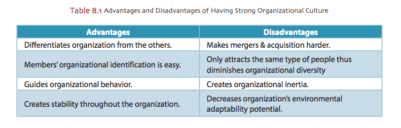 Disadvantages of having strong organizational culture are: 1.Makes mergers & acquisition harder. 2.Only attracts the same type of people thus diminishes organizational diversity. 3.Creates organizational inertia. 4.Decreases organization’s environmental adaptability potential.