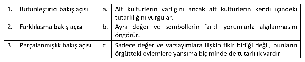 Yukarıda örgüt kültürüne bakış açıları ve açıklamalarının doğru eşleştirmesi aşağıdakilerden hangisinde verilmiştir?
