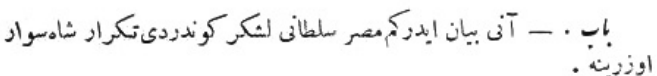 Bâb: Ânı beyân iderek kim Mısır sultânı leşker gönderdi tekrâr şâh süvar üzerine. |