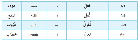 Zevk ve katl fa’l kalıbıyla; ömr ve şükr ise fu’l kalıbıyla türetilmiştir. Fi’l kalıbıyla türetilen tek kelime şükrdür.