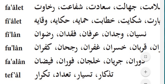 Başlıca cem’-i mükesser kalıpları: Ef’âl, fu’ûl, fu’ul, fu’al, fi’al, fi’âl, fu’’âl, fa’ale, fu’alâ, fe’â’il, fevâ’il, fevâ’îl, efâ’il, efâ’îl, ef’ilâ, ef’ile, mefâ’il, mefâ’îl, tefâ’îl, ef’ul vb. A şıkkındaki eşkâl ef’âl vezninde, B şıkkındaki süfün fu’ul vezninde, C şıkkındaki kibâr fi’âl vezninde, D şıkkındaki akâ’id fe’â’il vezninde çoğul isimlerdir. E şıkkındaki vukû’ât ise cem’-i sâlim-i müennes olan +at ekiyle türetilmiştir.