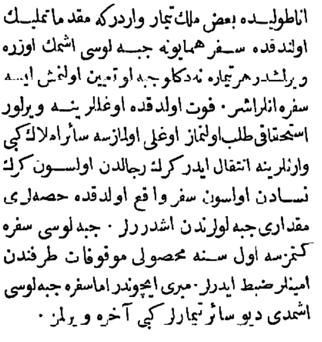 Anadolu’da ba‘zı mülk tîmâr vardır ki mukaddemâ temsik edilmekte sefer-i hümâyûna cebelüsü eşmek üzre virilmişdir. Her tîmâra ne denlü cebelü ta‘yîn olunmuş ise sefere anlar eşer. Mevt oldukda oğullarına virilür. İstihkakı taleb olunmaz. Oğlu olmazsa sâ’ir malik gibi vârislerine intikal ider. Gerek ricâlden olsun gerek nisâdan olsun sefer vâkı‘ oldukda hisseleri mıkdârı cebelülerinden eşdirirler. Cebelüsü sefere gitmezse olsene mahsûlü mevkufât tarafından emînler zabt iderler. Mîrî içündür ammâ sefere cebelüsü eşmedi deyu sâ’ir tîmârlar gibi âhara virilmez. |
