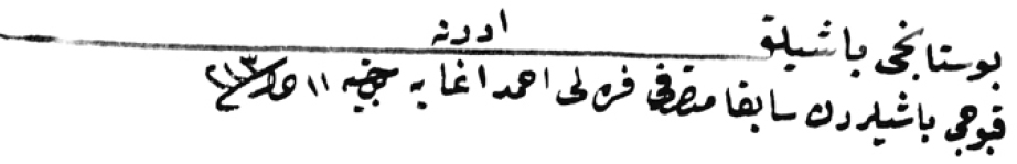 Bostancıbaşılık-ı Ordu: Kapucubaşılardan sâbıkā mutasarrıfı Fareli Ahmed Ağa’ya tevcîh, 11 Za (Zilka‛de) sene 213. |