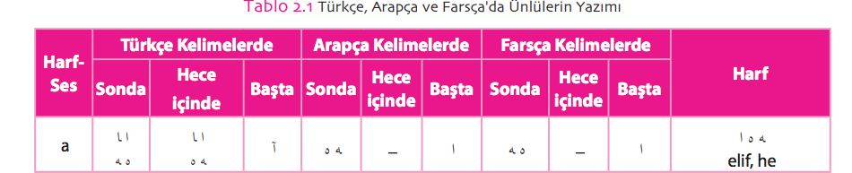ط tı = t : Arapça’ya özgü bir sesin işaretidir. Birkaç Farsça kelimede de karşılaşılır. Türkçe’nin kalın sıradan kelimelerinde ت te ve د dal yerine de kullanılmıştır. Daha çok kelime başında görülen bu kullanım sesin tonlu ve tonsuz okunması konusunda farklı değerlendirmelere yol açmıştır.