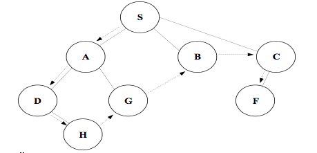 Önce derinliğine arama, çizge bir düğümden başlanarak bu düğümün komşusu üzerinden gidilecek en uzak düğüme kadar olan noktaların ziyaret edildiği ve daha sonra geri dönülerek aynı işlemlerin ziyaret edilmemiş düğümler için sürdürüldüğü arama algoritmasıdır. Dolayısıyla ziyaret sırası S, A, D, H, G, B, C, F’dir.