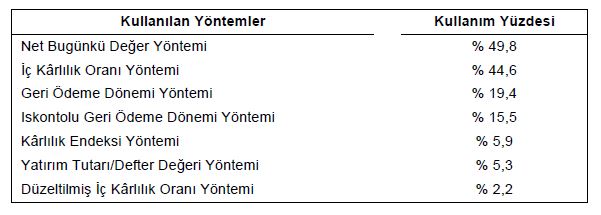 Yatırım projesinin seçiminde kullanılan yöntemlerin kendine özgü avantajlı ve dezavantajlı yönleri vardır. Yöntemler arasında akademik düzeyde en çok kabul gören yöntem, net bugünkü değer yöntemidir. 2002 yılında yapılan bir çalışmanın sonuçları tablo üzerinde gösterilmektedir. Buna göre en az tercih edilen yöntem Düzeltilmiş iç karlılık oranı yöntemidir. Doğru yanıt C’dir.