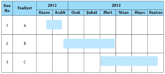 Organizasyon şemaları kurum içinde kimin kime bağlı olarak çalıştığını gösteren şemalardır. Hareket planları, faaliyetlere, başlangıç zamanı, bitiş zamanı, öncellik ilişkisi gibi bilgilerin ilave edilmesiyle hazırlanan planlardır. İş kırılım yapısı, proje içindeki faaliyetlerin ve proje çıktılarının teslimatlarının yönetilebilir alt gruplara bölünmesidir. RACI matrisi, proje çalışanlarının sorumlulukları ve rollerinin açıklanması için kullanılan matristir. Gantt şeması ise proje zaman çizelgesinin geliştirilmesi için kullanılan araçlardan biri olup soruda verilen Şekil örnek bir Gantt şemasıdır.