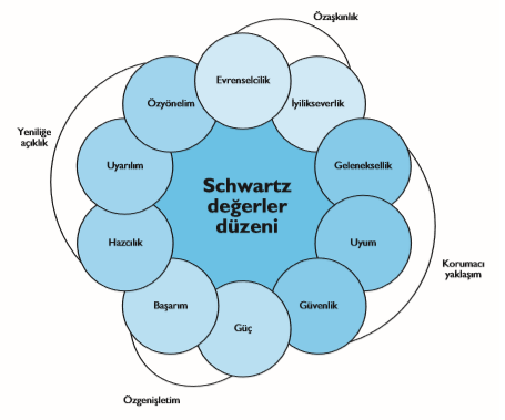 Parsons and Shils (1951) ve Kluckhohn and Strodtbeck (1961) tarafından yapılan ilk kapsamlı çalışmalardan bugüne değerler, sayısız araştırmada ana değişken olarak kullanılagelmektedir. Bireylerin değer sistemlerini anlamaya yönelik çalışmaların başında Shalom Schwartz tarafından geliştirilen model gelir. Modele göre, çeşitli kuramcıların üzerinde uzlaştıkları tanımlamalardan yola çıkarak değerler inanç olarak tanımlanır ve duygularla iç içe geçtiği varsayılır. Modele göre, insanların evrensel gereksinimleri olarak tanımlanabilecek, farklı ihtiyaçları temsil eden on farklı değer vardır. Bunlar başarı, güç, hazcılık, uyarılım, özyönelim, evrenselcilik, iyilikseverlik, geleneksellik, uyma ve güvenlik olarak adlandırılmaktadır. Bu değerler, iki ana boyutta, yeniliğe açıklık-korumacı yaklaşım karşıtlığı ve özaşkınlık-özgenişletim karşıtlığı olarak sınıflandırılabilmektedir. Aşağıdakilerden hangisi özaşkınlık-özgenişletim karşıtlığı ile ilgilidir?