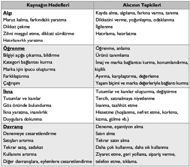 Tablo 3.1: Reklamda Kaynağın-Hedef‘e göre Alıcıların-Tepkisi
