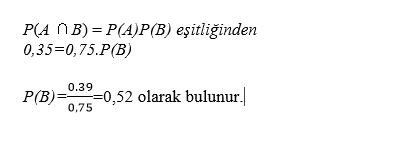 Laboratuvarda yapılan bir deneyin gerçekleşme olasılığı 0,75 ve olasılığı bulunmuştur. A ve B olaylarının bağımsız olabilmesi için, B olayının gerçekleşme olasılığı kaç olmalıdır?
