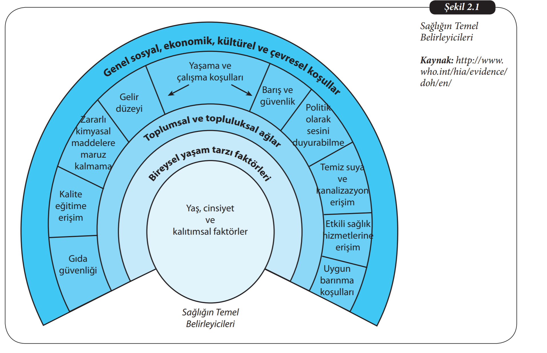 Sağlık belirleyicileri genel olarak aşağıdaki şekilde gösterilmiştir. “Genden yerküreye”