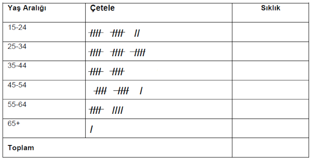 Ağız ve diş sağlığı polikliniğine başvuran hastaların yaşlarına ait çetele tablosu aşağıda verilmiştir. Buna göre toplam sıklık sayısı kaçtır?