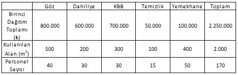X Hastanesinde esas maliyet yerleri ile yardımcı maliyet yerlerine ait birinci dağıtım sonuçları ve dağıtım anahtarları aşağıdaki tabloda verilmiştir.