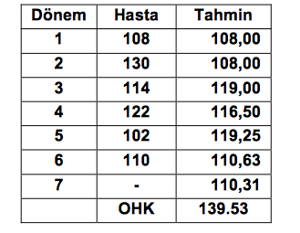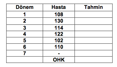 Yukarıdaki veri için, Üstel Düzleme tekniği kullanılarak öngörü hesaplanırsa, 3. dönem hasta sayısı kaç olarak hesaplanır?