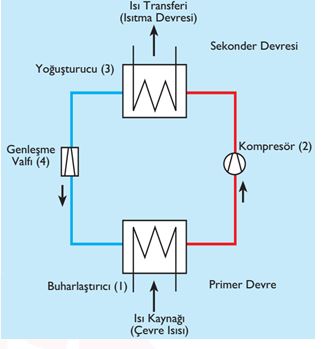 Şekilde gösterilen ısı pompası elektrik tahrikli kompresörlü ısı pompasına aittir. Çalışma prensibi şu şekildedir: çevreden ısı çekildiğinde, buharlaştırıcıdaki sıvı fazlı soğutucu akışkan düşük basınç altındadır ve düşük bir sıcaklık seviyesindedir (1). Buharlaştırıcıdaki düşük sıcaklık seviyesi sayesinde soğutucu akışkan buharlaşır ve çevreden ısı çeker. Kompresör (2) akışkan buharını emer ve sıkıştırarak basınçlandırır. Sıkıştırma sırasında buhar fazındaki akışkanın basıncı arttığı için sıcaklığı da artar. Kompresördeki sıkıştırma işleminden sonra buhar fazındaki akışkan yoğuşturucuya gelir. Yoğuşturucuyu (3) çevreleyen tesisat suyunun sıcaklığı, soğutucu akışkanın yoğuşma sıcaklığından düşüktür. Buhar fazındaki akışkan soğuyarak sıvı faza geçer. Buharlaştırıcının çevreden çektiği ısı ve kompresördeki sıkıştırma işlemi sırasında ilave edilen elektrik enerjisi ısıtma suyuna aktarılmış olur.