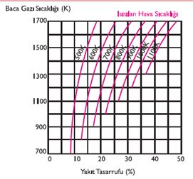 Yukarıda verilen diyagrama göre baca gazı sıcaklığı 1100 K olan bir fabrikada ısıtılan hava sıcaklığı 600 K ise sağlanan yakıt tasarrufu ne kadardır?